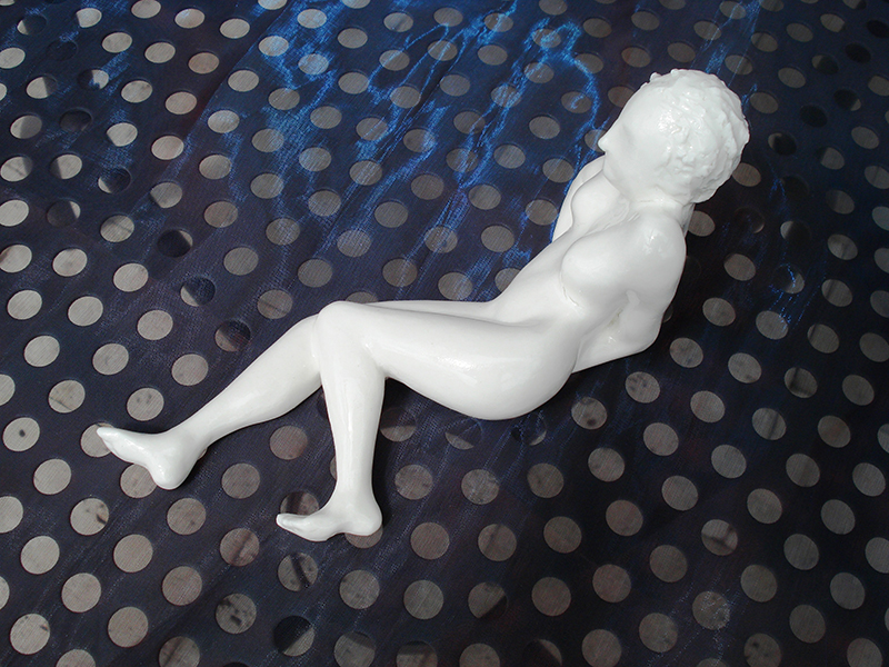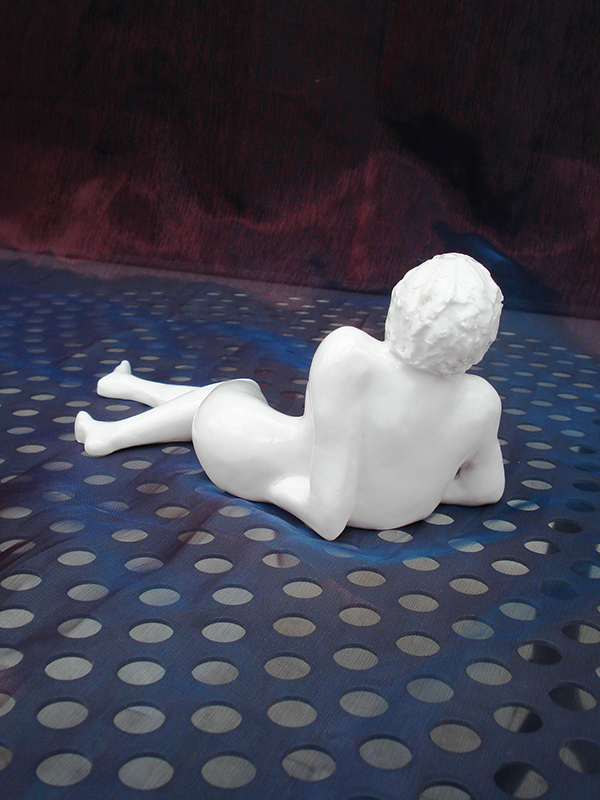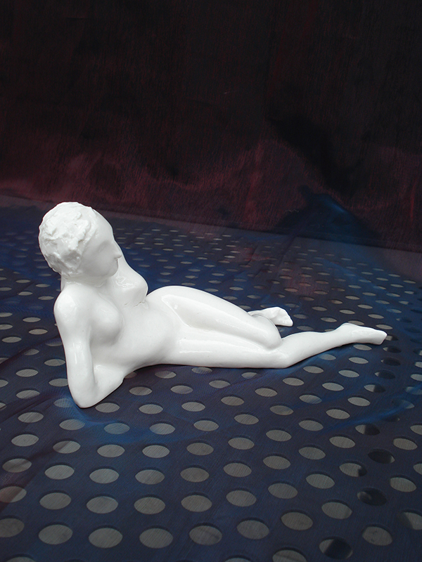 Die Aktfigur habe ich aus Porzellanton modelliert und sie ist nicht gegossen. Ich habe die Porzellan-Skulptur schrühgebrannt und geschliffen. Sie ist mit Transparentglasur glasiert und in einem zweiten Brand mit hoher Temperatur gebrannt.