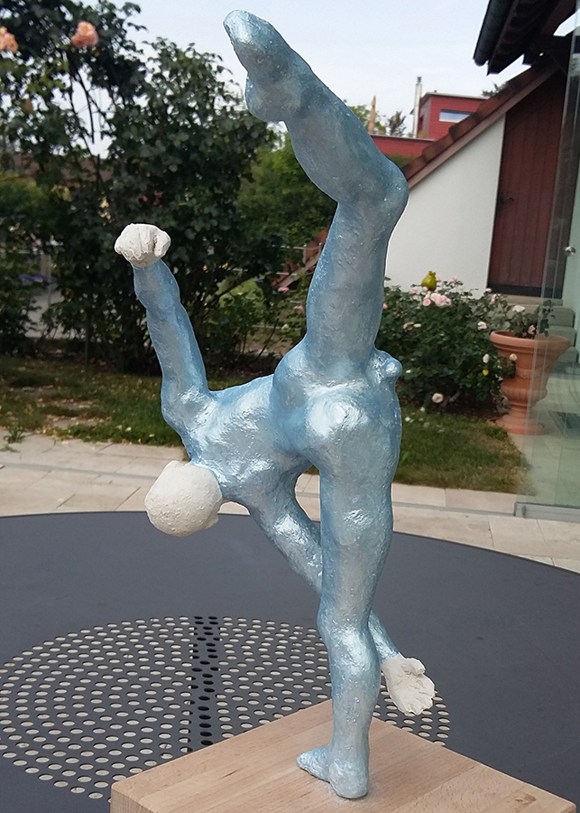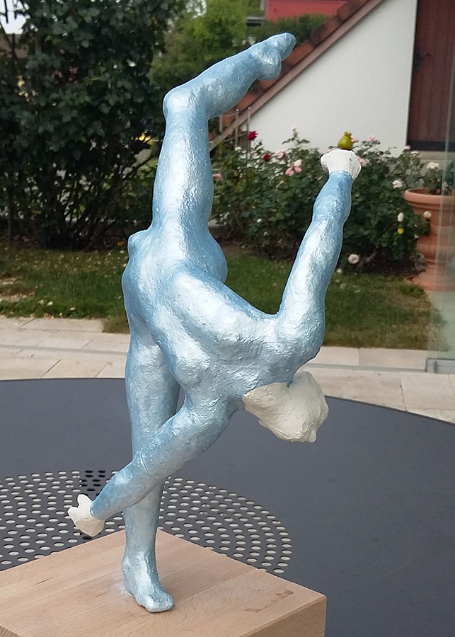 Die Keramikfigur «Tänzer» gleicht einem Bogen aus dieser Sicht. die Figur steht stabil auf einem Bein dynamisch und gespannt zugleich, auch gleicht die Keramikfigur einem Vogel. Sie ist blaubamalt mit einem Ballett Suit.